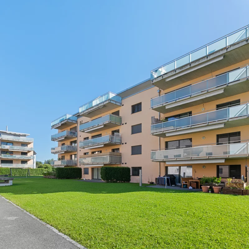 Ensemble de trois immeubles résidentiels et parking, datant de 2008, situés à l’est de la commune de Sevelen.